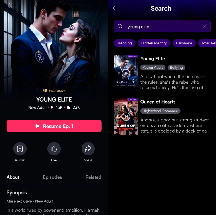 [Screenshot from MyMuse (left) and My Drama (right)]