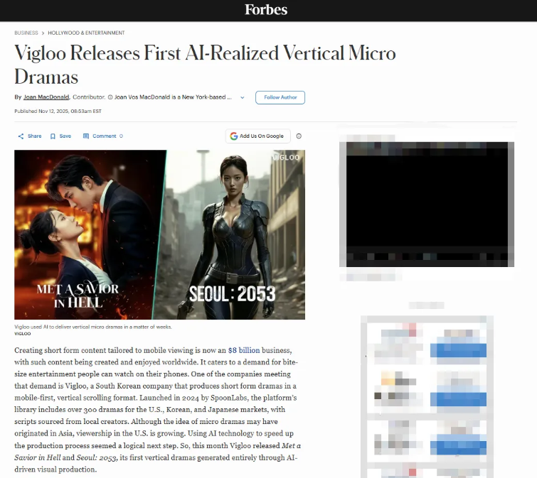 In October this year, Met a Savior in Hell and Seoul: 2053, marketed as "South Korea's first batch of AI-generated micro-dramas," premiered exclusively on Vigloo and were reported by Forbes.