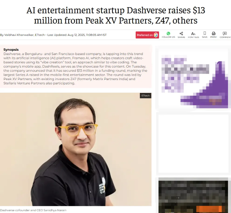 ● India's Dashverse successfully secured $13 million in funding for its AI micro-drama business, issuing a mandate to produce 100 episodes before the end of the year.